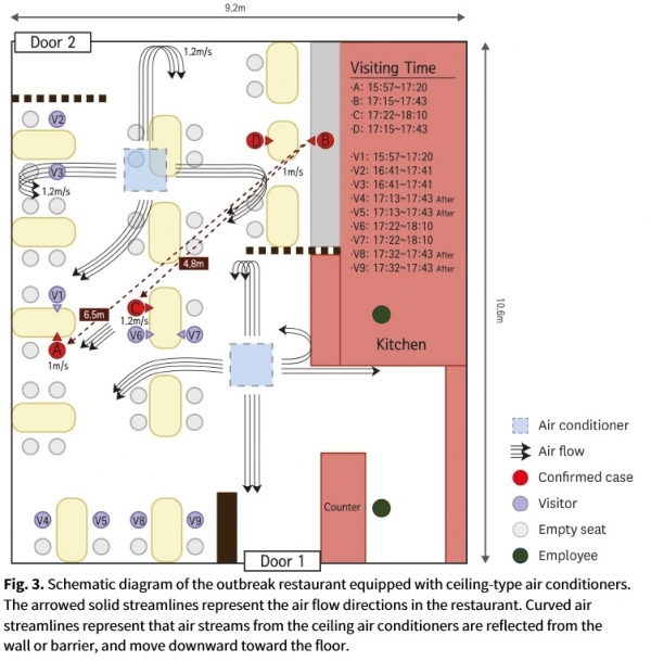 연구팀은 해당 식당에 천장 에어컨 2대가 가동 중이었던 점에 주목했다. 당시 A씨와 C씨는 마주보는 형태로 앉아있었으며 에어컨 바람은 A씨와 C씨가 앉아있던 방향으로 순환하고 있었다는 결론이 나왔다.