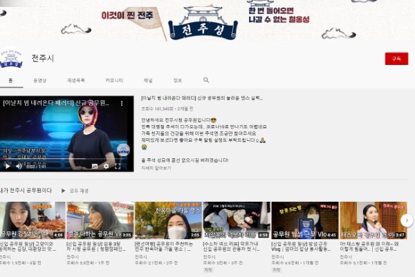 전주시는 지난 9월부터 전주시 공식 유튜브 채널 ‘전주성’에서 ‘내가 전주시 공무원이다’를 운영한 결과 구독자 수가 이전 대비 2.5배가 늘어난 것으로 집계됐다고 2일 밝혔다.