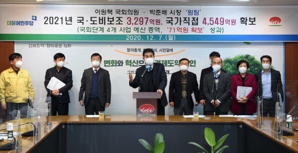 박준배 김제시장은 7일 시청 2층 상황실에서 이원택 국회의원과 함께 기자회견을 열고 내년도 국·도비 보조예산을 올해보다 216억 원이 증액된 3297억원과 국가직접 4549억원 등 총 7846억원의 예산확보를 밝혔다.