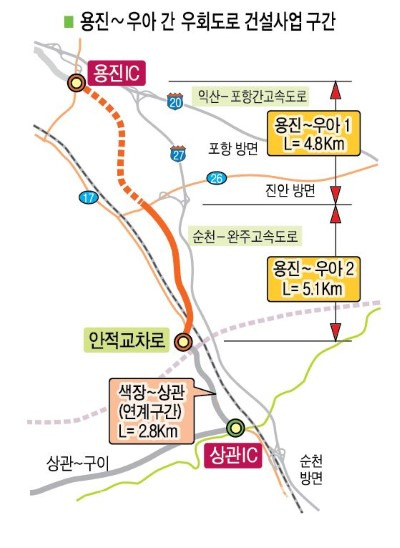 ‘용진~우아 간 국도 대체 우회도로’는 전주시 관내 우회도로(49.1km) 중 마지막 구간이다. 용진에서 국도 26호선 간 4.8km 구간인 1공구는 2016년 10월, 국도 26호선부터 국도 17호선까지인 5.1km 구간인 2공구는 지난해 7월에 각각 착공했다.