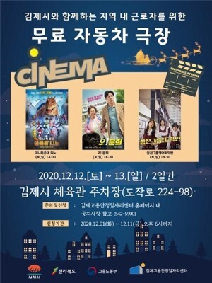 김제고용안정일자리센터(센터장 김태한)는 근로자 문화의날 일환으로 오는 12일(토)부터 13일(일)까지 2일간 김제시 체육관 주차장에서 무료 자동차 극장을 운영한다.