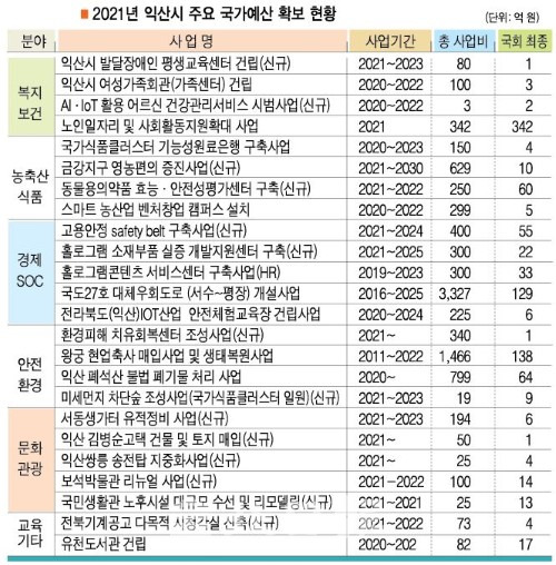 익산시는 쉽지 않은 여건 속에서도 중점사업을 선정, 지역 정치권 및 전북도와 유기적인 공조체계를 구축해 끊임없이 대응한 결과 국회단계 감액 없이 올해 확보액 7152억원보다 890억원이 늘어난 8042억원을 확보했다.