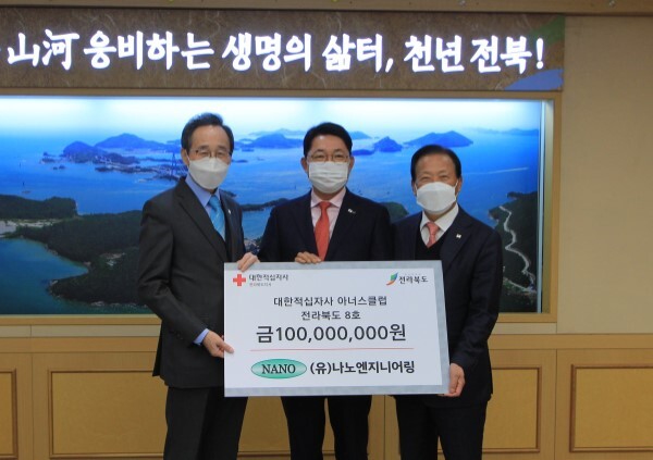 대한적십자사 전북지사(회장 이선홍)는 (유)나노엔지니어링(대표 김성희)에서 더불어 사는 지역공동체를 위해 성금 1억원에 대한 기부를 약속했다고 9일 밝혔다.