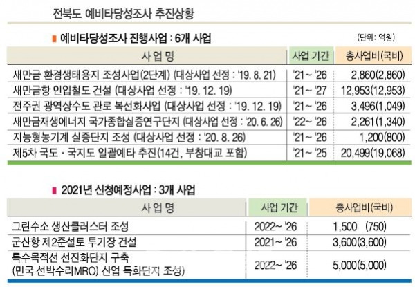새만금 사업의 속도감을 높일 새만금 환경생태용지 조성(2단계 2860억 원)과 새만금항 인입철도 건설(1조2953억 원), 새만금재생에너지 국가종합실증연구단지 구축(2261억 원)도 내년부터 예타에 들어간다.