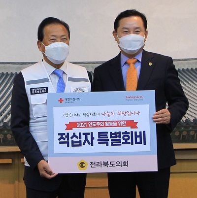 대한적십자사 전북지사(회장 이선홍)는 10일 전북도의회(의장 송지용)가 도내 취약계층을 위한 인도주의 활동에 써달라며 2021년도 적십자 특별회비를 전달했다고 밝혔다.