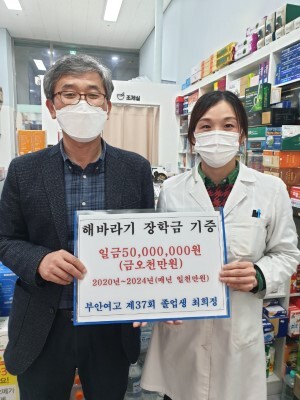 최희정씨는 자신이 운영하고 있는 약국에서 최규연 부안여고 교장에게 올해부터 2024년까지 5년 동안 매년 1천만 원씩 총 5천만 원의 학교발전기금을 기탁키로 하는 기증식을 가졌다.
