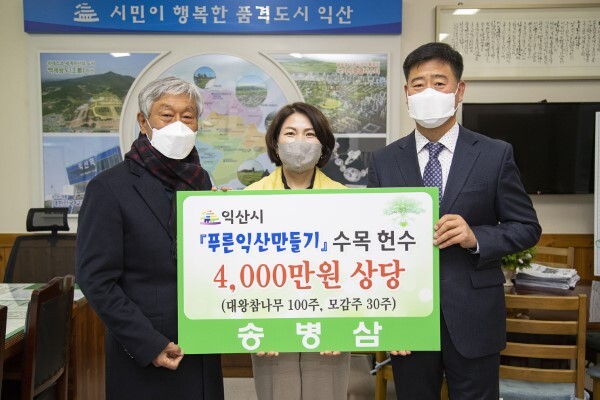 전주 시민 송병삼 씨는 지난 11일 익산시를 방문해 환경친화도시 푸른익산 만들기에 사용해 달라며 4000만원 상당의 대왕참나무 100주와 모감주 30주를 기탁했다.