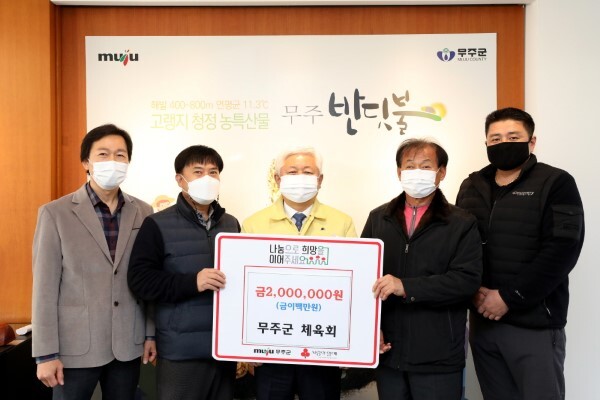 무주군체육회 송재호 회장은 14일 관내 저소득층 주민들을 위한 성금 200만 원을 무주군에 기탁했다. 같은 날 한수원 무주양수발전소 최정원 소장도 무주군청을 찾아 불우이웃돕기 성금 400만 원을 기탁했다.