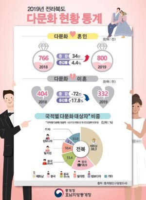 14일 호남지방통계청이 공개한 ‘2019년 호남·제주 다문화 현황’에 따르면 지난해 도내 다문화 결혼은 800건으로 전년(766건) 대비 34건(4.4%) 늘었다.