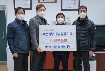 성금을 기탁한 기부자와 성덕면 이장협의회는 평소 지역주민들의 애로사항을 해결하는 데 앞장서며 궂은일을 도맡아 하고 있어 지역사회의 큰 귀감이 되고 있다.