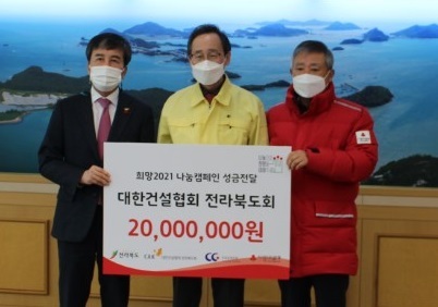 대한건설협회 전라북도회(회장 윤방섭)와 건설공제조합(이사장 김영묵)은 지난 14일 코로나19 확산으로 유난히 힘든 연말연시를 맞고 있는 지역의 어렵고 소외된 이웃을 위해 전라북도청을 방문, 송하진 도지사에게 불우이웃돕기 성금 2000만원을 전달했다.