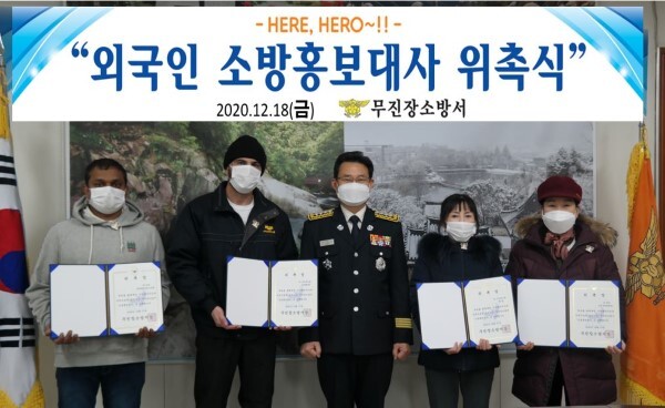 위촉된 4명은 △아짐존(우즈베키스탄) △리화(중국) △김명화(중국) △산지와(스리랑카) 씨 등이다. 이들에게는 위촉장과 홍보 배지(badge)가 수여되고, ‘HERE, HERO~!! 외국인 소방홍보대사’란 명칭이 부여됐다.