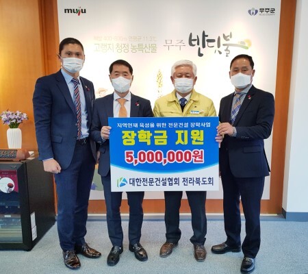 대한전문건설협회 전북도회(회장 김태경)는 지난 18일 무주군청을 방문하고 황인홍 무주군수를 만나 지역 인재육성을 위한 장학금 500만원을 전달했다.