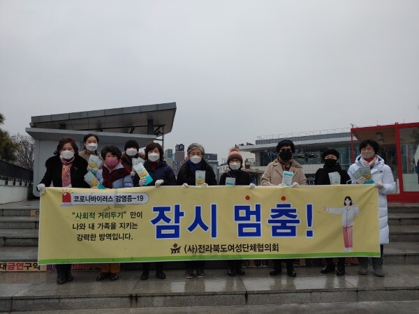 전북여성단체협의회(이하 전북여협)는 지난 18일 전주 고속버스터미널 일대에서 마스크를 나눠주며 사회적 거리두기 동참 독려 캠페인을 벌였다.