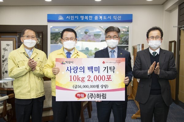 ㈜하림(대표이사 박길연)은 21일 정헌율 익산시장을 방문해 어려운 이웃을 위해 달라며 10kg짜리 백미 2000포(시가 5600만원 상당)를 쾌척했다.