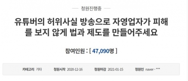 결국 유투버 A씨의 허위고발로 피해를 본 업주는 국민청원에 글을 올려 자신이 겪은 억울한 일에 대해 호소했다. 지난 16일 올라온 이 청원에는 일주일새 4만7000여명의 국민이 동의했다.