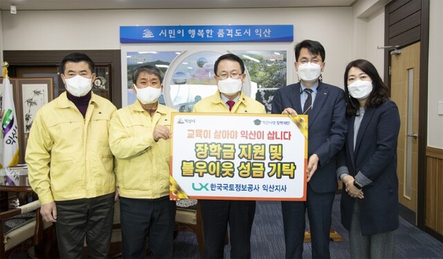 한국국토정보공사 익산지사(지사장 김희범)는 22일 익산시를 방문해 장학금과 이웃돕기 성금으로 300만원을 기탁했다.
