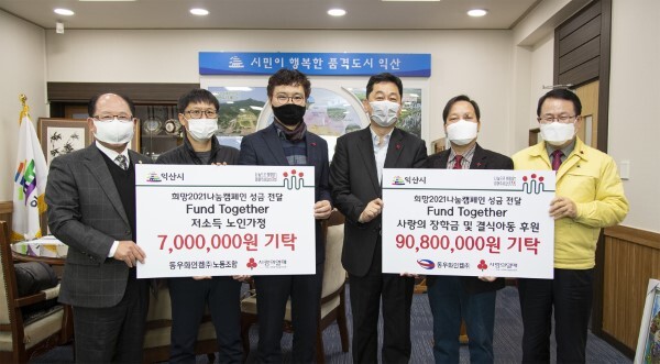 익산동우화인켐(주)(공장장 윤대웅)과 노동조합(위원장 전세성)은 23일 정헌율 익산시장을 방문해 청소년을 위한 사랑의 장학금·결식아동 후원금 9080만원과 저소득 노인가정 후원금 700만원을 각각 기탁했다.