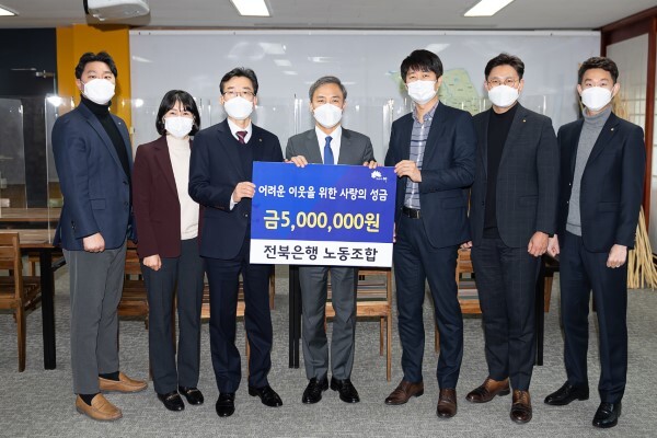 전북은행 노동조합(위원장 최강성)은 지난 22일 전주시청을 찾아 김승수 시장에게 경제적으로 어려운 이웃들을 위한 사랑의 성금 500만원을 기탁했다.