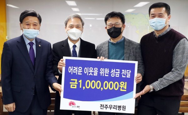전주우리병원(대표원장 김재엽)은 지난 24일 소외계층에 전달해 달라며 성금 100만 원을 전주시에 맡겼다.