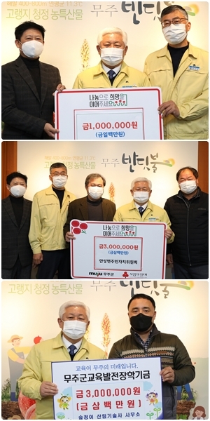 지난 24일 안성면 지역사회보장협의체가 성금 100만원을, 안성면 주민자치위원회(위원장 이재국)에서 300만원을 추운 겨울을 맞는 어려운 이웃에게 전달해 달라며 무주군에 기탁했다.같은 날 숲정이 산림기술사 사무소(대표 윤여인)에서 300만 원의 장학금을, 무주읍 소재 음식점 명가(대표 김민주)에서 100만원의 장학금을 (재)무주군교육발전장학재단에 각각 전달했다.