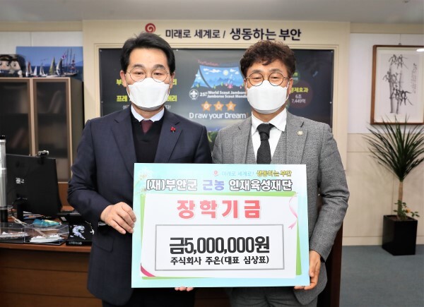 코로나19가 장기간 지속되는 어려운 상황에도 불구하고 주식회사 주은 (대표 심상표)는 28일 부안군 근농인재육성재단을 방문해 지역인재 육성사업에 동참하고자 장학금으로 500만원과 어려운 이웃을 위해 쌀 100포(10㎏.300만원)을 기탁해 지역사회에 따뜻한 온정을 더했다.