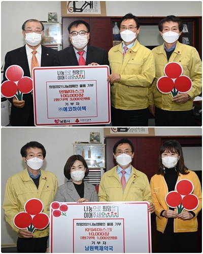 이환주 남원시장은 “코로나19 확진자가 늘어 모두가 불안하고 어려운 시기이지만 나눔에 동참한 업체와 기업들에 참으로 감사하다”며 “기업과 관이 협력해 하루빨리 코로나19가 종식되기를 바란다”고 말했다.