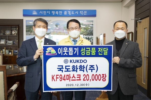 또한, 국도화학(주) 서부사업소(소장 이경훈)도 이날 익산시를 방문해 코로나19 극복을 위한 KF94 마스크 2만장(시가 540만원 상당)을 기탁했다.