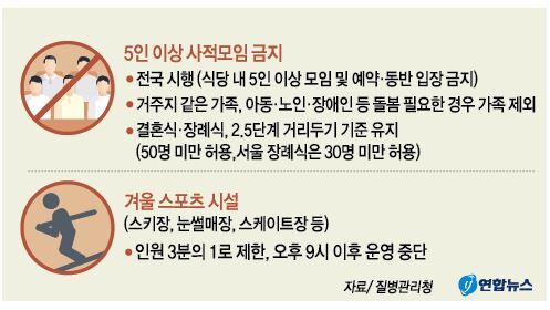 보완된 추가 대책으로는 5명부터 사적 모임이 금지되고 겨울스포츠시설(21시~5시) 운영 중단, 숙박시설 2/3 예매 제한, 아파트 내 편의시설 운영 중단, 주민센터 문화·교육강좌 등 프로그램 중단 등이 이뤄진다. 다만, 5인 이상 사적 모임의 경우 거주공간이 동일한 가족이거나 아동·노인·장애인 돌봄에 필요한 경우, 임종 가능성이 있어 가족이 모이는 경우 등은 허용된다.