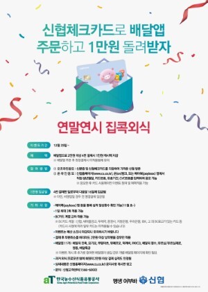 이번 프로모션은 지난 해 11월 코로나19의 3차 확산으로 중단된 ‘대한민국 세 번째 농할 외식’ 프로모션의 일환으로 카드 이용객은 배달앱을 통해 BC계열 카드(신협 체크카드 포함)로 2만 원 이상 4회 결제 시 1만 원의 캐시백을 받을 수 있다. 일 최대 2회까지 결제 횟수가 인정되며 캐시백은 4회 실적 달성 시 다음달 16일에 계좌로 입금된다.