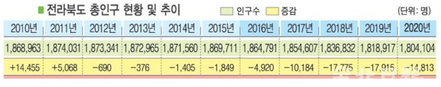 연내 전북인구 180만 명 붕괴가 기정사실화되면서 국가차원의 인구정책 재설계가 필요하다는 지적이다. 행정안전부가 집계한 전북도내 주민등록 인구는 180만4000명이지만, 통계청은 전북인구가 이미 179만 명 수준이라고 지난해 9월 조사를 실시한 바 있다.