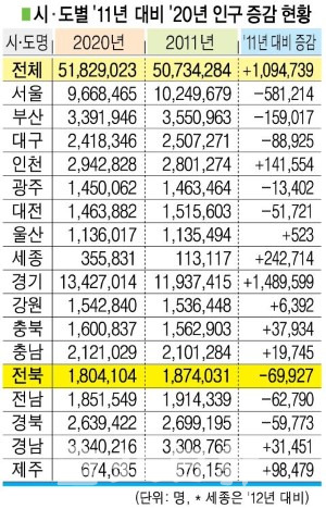 4일 행정안전부와 전북도, 통계청 등에 따르면 전북지역은 1945년 우리나라가 해당 된 이후 인구가 감소한 국내 유일한 지역이다. 전북인구는 지난 1973년 250만5000명으로 최고점을 찍은 이후 지속적인 감소세를 거듭했다.