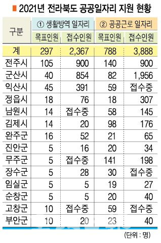 이러한 상황은 공공근로 일자리 사업에도 마찬가지로 나타났다. 환경정비·정화 등의 업무를 주로 담당하는 공공근로의 경우도 788명을 모집하는데 3888명의 인원이 신청했다. 군산시는 82명을 모집하는데 1956명이 신청했고, 140명을 모집하는 전주시의 경우도 900명이 지원했다.