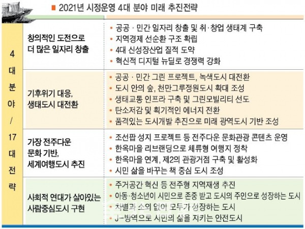 김승수 전주시장은 2021년 신축년 ‘상상력과 용기, 연대의 힘으로 전주의 담대한 미래를 열겠다’는 시정 운영 비전을 제시하고, 코로나19로 벼랑 끝에 내몰리고 있는 민생경제의 반등을 이끄는데 온 힘을 모으기로 했다.