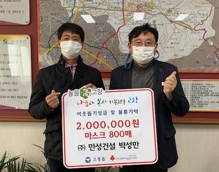 지난 7일 ㈜만성건설 박성만 대표가 어려운 이웃에 전해 달라며 성금 200만원과 함께 마스크 800장을 고창읍에 전달했다.