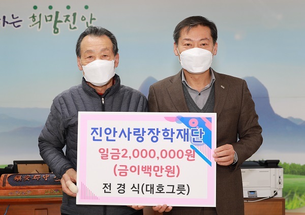 진안 ‘대호그릇’ 전경식 대표가 지역인재 양성에 써 달라며 12일 진안사랑장학재단(이사장 전춘성)에 100만원의 장학금을 기탁했다.