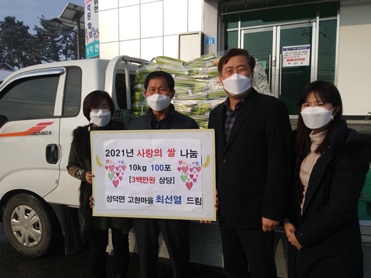 강기수 성덕면장은“코로나19 장기화로 힘든 시기에 어려운 이웃을 위해 정성을 보태주신 최선열부회장께 감사드린다.”며 기탁받은 백미는 기부자의 뜻에 따라 생활 형편이 어려운 저소득 계층에게 소중히 전달하겠다.”고 전했다.