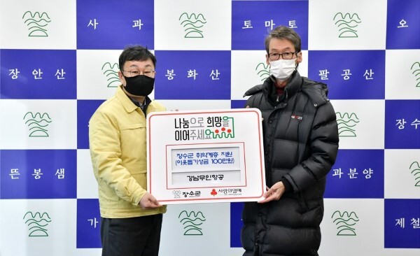 강남무인항공 황철규 대표가 14일 관내 어려운 이웃을 위해 써달라며 성금 100만원을 장수군에 전달했다.