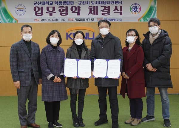 군산대학교 학생생활관과 도시재생지원센터는 19일 군산대 학생생활관 세미나실에서 업무협약을 맺었다.
