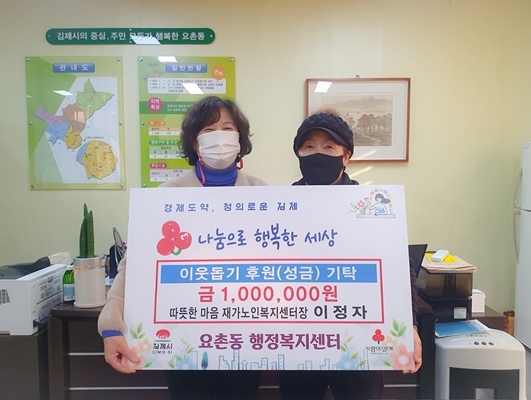김제시 요촌동 따뜻한 마음 노인재가복지센터(센터장 이정자)는 겨울철 어려운 이웃을 위해 이웃돕기 성금으로 100만 원을 기탁했다.