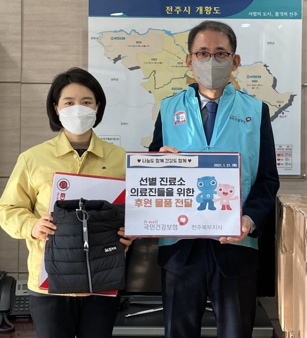 건강보험공단 전주북부지사(지사장 허도한)는 21일 코로나19 극복을 위해 노력하는 전주시 선별진료소 의료진에게 방한용품을 기부했다.