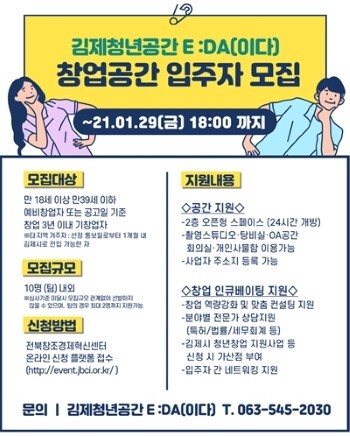 김제청년공간 E :DA(이다)(센터장 박광진)가 청년창업 인큐베이팅 공간 입주자 10명을 모집한다.