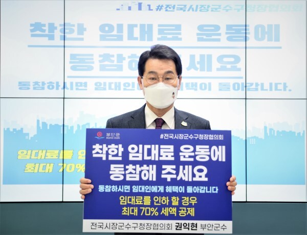 권익현 부안군수가 25일 코로나19로 어려움을 겪고 있는 소상공인 자영업자들을 위한 착한 임대료 확산 챌린지 캠페인에 동참했다.
