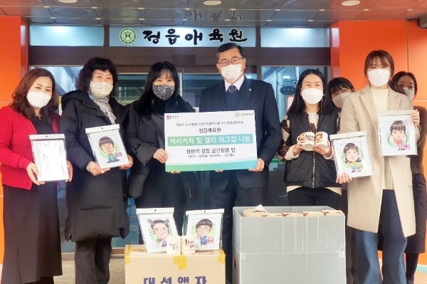지난 22일 도시재생 뉴딜사업(공기업 제안형) 주민역량 강화교육의 일환으로 진행된 정읍역 광장 공간활용팀 주민 교육 수료자들이 캘리그라피 머그컵 100개와 직접 그린 아동 50명의 캐리커처를 아동들에게 선물한 것.