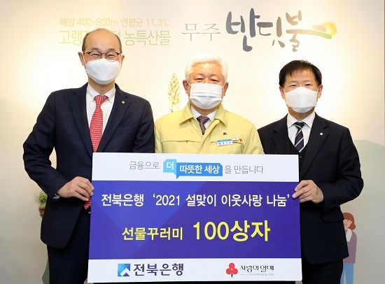 전북은행 무주지점(지점장 이경호)이 새해 이웃돕기 성품으로 생필품 꾸러미 100박스(250만원 상당)를 무주군 측에 전달했다.