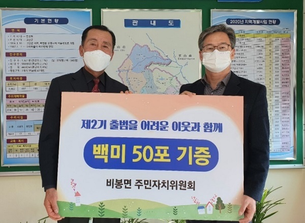 지난 25일 제2기 위원회 구성을 마친 완주군 비봉면 주민자치위원회가 주민자치 활성화와 지역공동체 결속을 위해 사랑의 쌀 50포대를(1포대 20kg) 후원했다.
