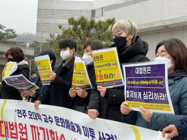 단체는 “피고인은 전북지역에서 오랜 기간 극단 대표와 축제 예술감독 등으로 활동하며 대학에서 교편을 잡았고, 지역 예술계에서 쌓은 경력과 교수라는 지위를 이용해 학생들에게 각종 접대와 노동을 강요하는 ‘갑질’과 성폭력을 일삼았다”고 지적했다.
