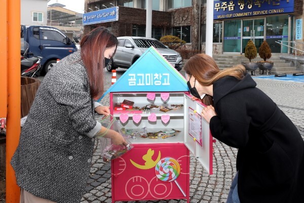 무주군마을공동체지원센터가 ‘착한 나눔 문화 확산 프로젝트’의 일환으로 설치한 ‘곰고미 창고’는 현재 설천면 불대마을과 부남면 우체국, 안성면 시장, 적상면 행정복지센터, 무주읍 행정복지센터, 무주군청 민원실, 무주 종합복지관 등 7곳에 마련돼 있다. 향후 주민의견을 모아 필요한 3곳을 추가로 선정·설치할 예정이다.