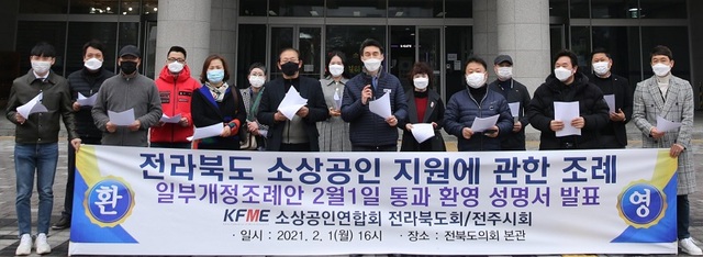 소상공인연합회 전라북도회(회장직무대행 임규철)와 전주시회(회장 임규철)가 1일 전북도의회 본관 앞에서‘전라북도 소상공인 지원에 관한 조례’일부개정조레안 통과 환영 성명서를 발표했다.