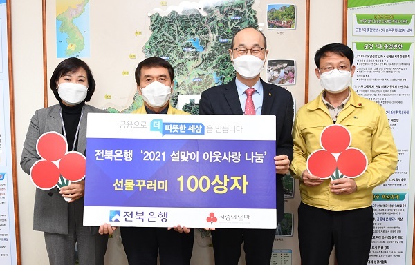 JB전북은행(은행장 임용택)이 설 명절을 맞아 완주군에 이웃사랑 선물꾸러미 100상자(250만원 상당)를 전달했다.
